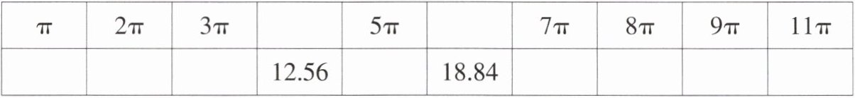 3.14, 6.28, 9.42, 4π, 15.7, 6π, 21.98, 25.12, 28.26, 34.54