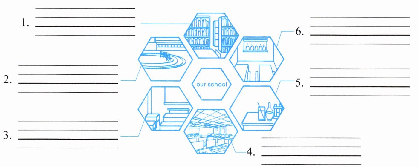 1. library 2. dining hall 3. playground 4. science lab 5. classroom