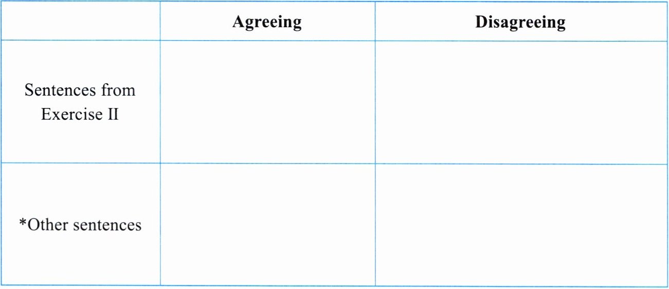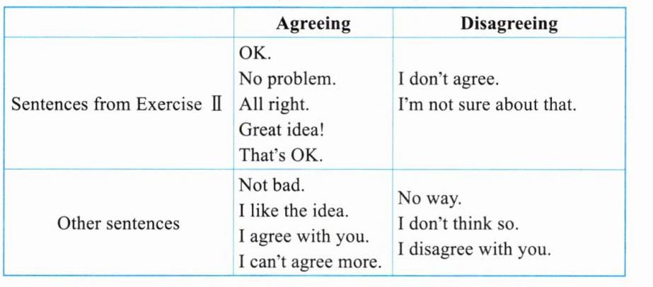 Ⅲ. Read the conversation in Exercise II and find out the expressions of agreeing and disagreeing. 阅读练习II的对话,列出表示赞同和不赞同的表达方式。