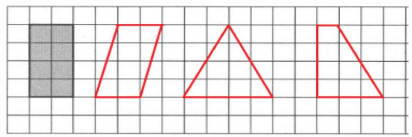 1. 在下面的方格纸上分别画一个平行四边形、一个三角形、一个梯形,使它们的面积与图中长方形的面积相等。(每个小方格的面积是$1 cm^2)$