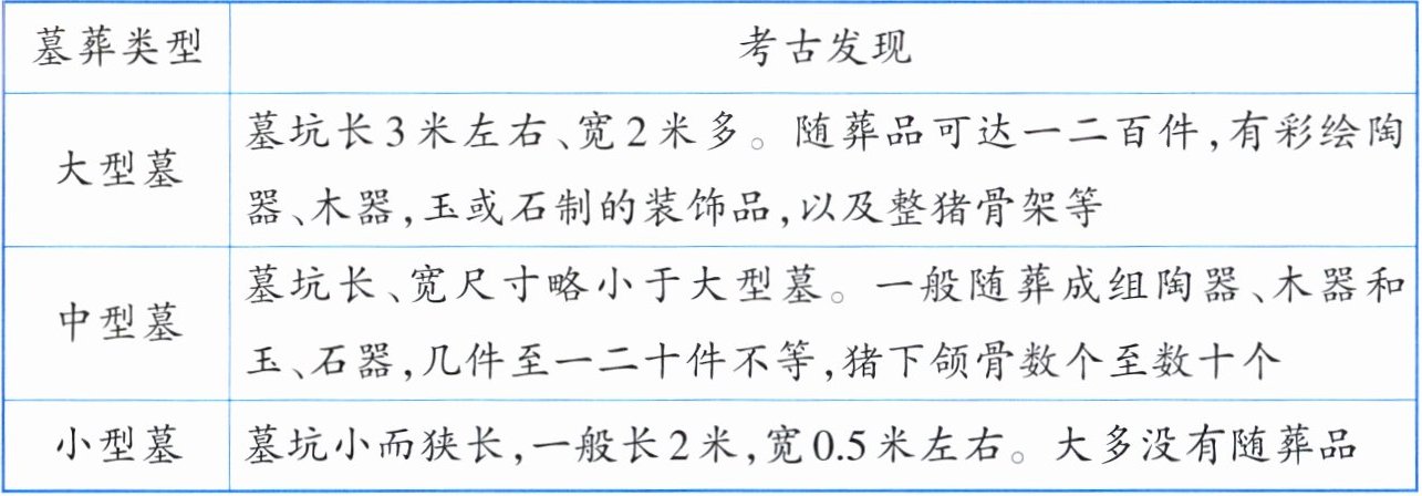 | 大型墓 | 墓坑长3米左右、宽2米多。随葬品可达一二百件,有彩绘陶器、木器,玉或石制的装饰品,以及整猪骨架等 |