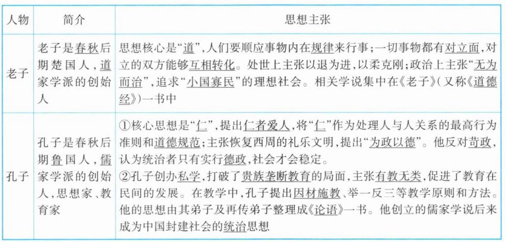 孔子 孔子是春秋后期鲁国人,儒家学派的创始人,思想家、教育家 ①核心思想是“仁”,提出仁者爱人,将“仁”作为处理人与人关系的最高行为准则和道德规范;主张恢复西周的礼乐文明,提出“为政以德”。他反对苛政,认为统治者只有实行德政,社会才会稳定。②孔子创办私学,打破了贵族垄断教育的局面,主张有教无类,促进了教育在民间的发展。在教学中,孔子提出因材施教、举一反三等教学原则和方法。他的思想由其弟子及再传弟子整理成《论语》一书。他创立的儒家学说后来成为中国封建社会的统治思想