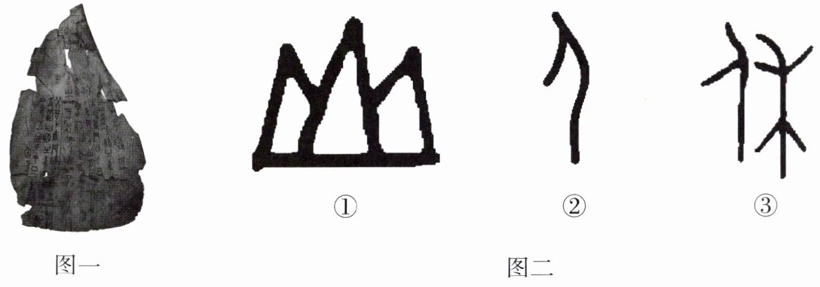 (1)图一所示甲骨文字出自哪个朝代? 观察图二中的三个甲骨文文字(描摹图),把它们分别与休、人、山这三个现代汉字对应起来。(4分)