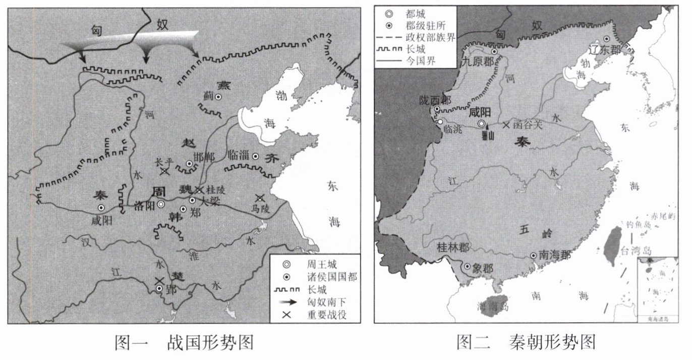 不同之处:①疆域大小(性质):图一中的秦是战国时期的诸侯国,图二中的秦是完成了统一的秦王朝;②地方行政区划设置:图一中的秦国实行县制,图二的秦朝实行郡县制(4分,其他合理答案可酌情给分)。原因:秦完成统一大业。(2分)