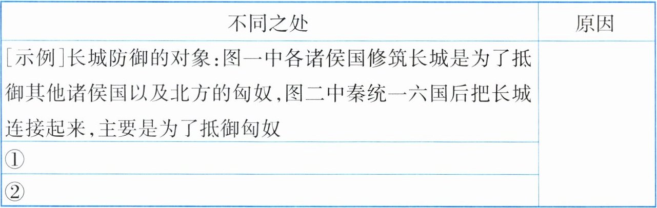 |[示例]长城防御的对象:图一中各诸侯国修筑长城是为了抵御其他诸侯国以及北方的匈奴,图二中秦统一六国后把长城连接起来,主要是为了抵御匈奴|