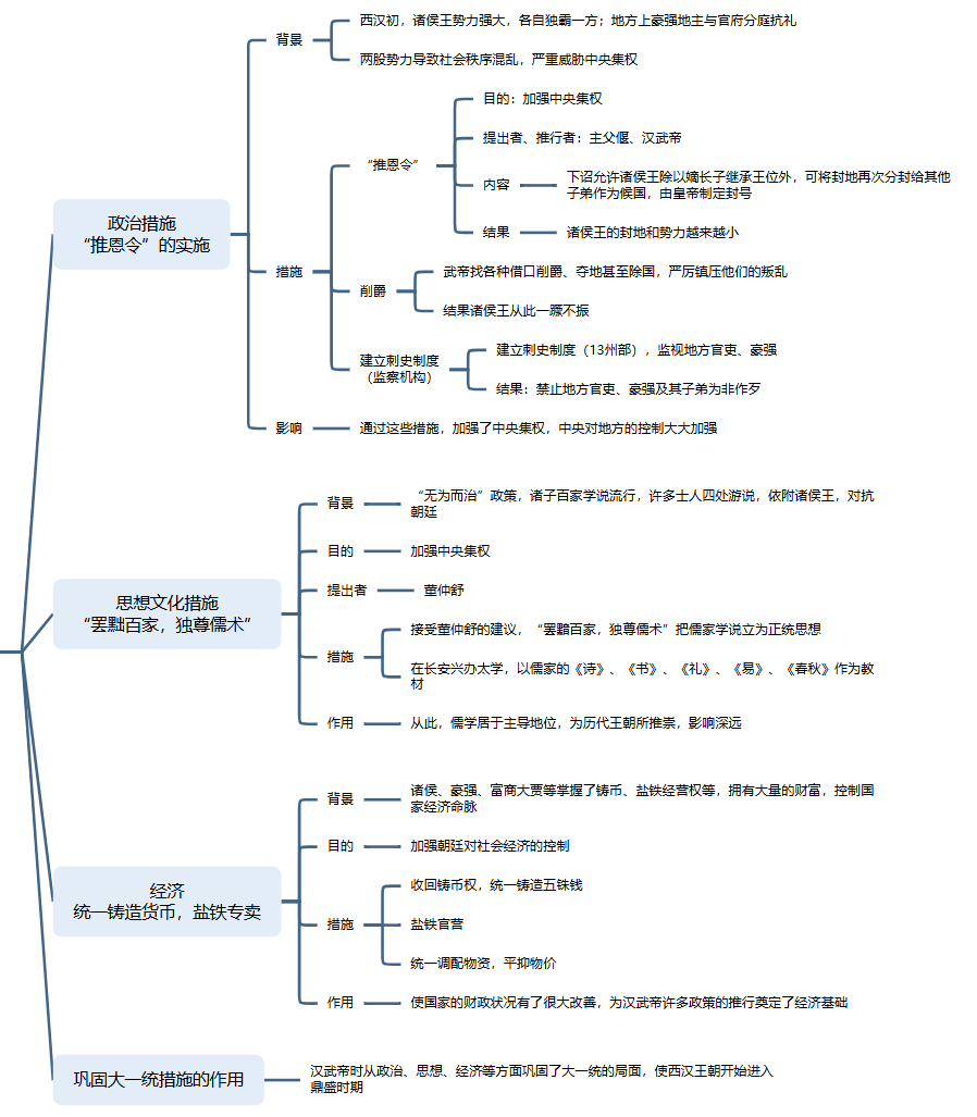 这样的设计意图旨在帮助老师和学生清晰地理解大一统王朝在政治、经济、文化等方面的巩固措施及其相互之间的联系,从而更好地掌握和记忆这一时期的历史知识。