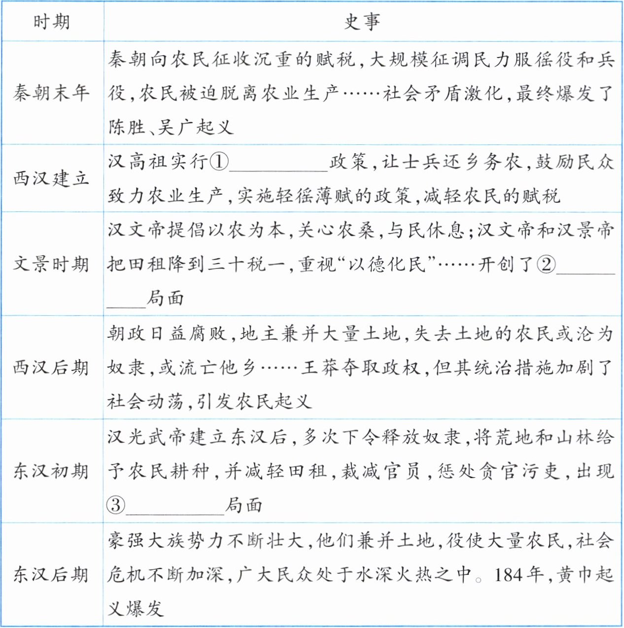 | 西汉建立 | 汉高祖实行①______政策,让士兵还乡务农,鼓励民众致力农业生产,实施轻徭薄赋的政策,减轻农民的赋税 |