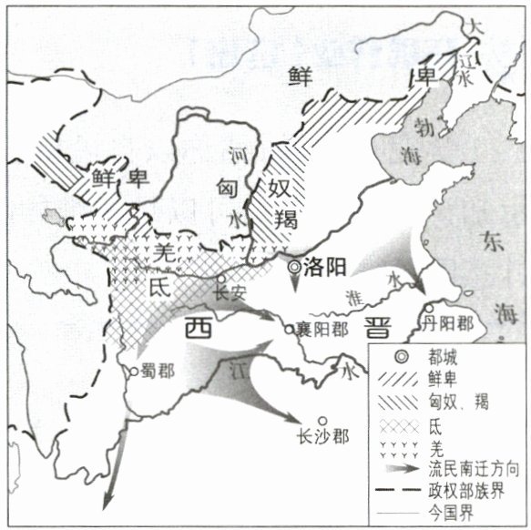 (1)北方各族内迁;北方人口南迁。(4分)(2)由于气候寒冷,自然条件恶劣,所以北方民族内迁;八王之乱使北方社会动荡,中原人口大量逃往南方。(4分)