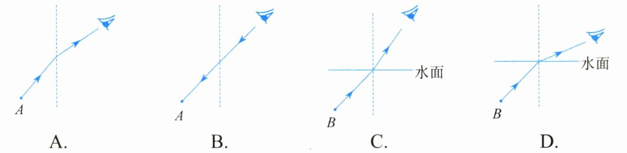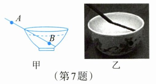 7. 标有$A$、$B$两点的筷子放在空碗中,如图甲所示。向碗中加水至虚线处,观察到如图乙所示场景,此时看到筷子上的$A点或B$点,光的传播路径正确的是( )。