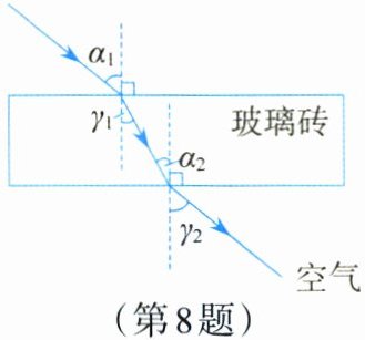 8. 一束光从空气中斜射向玻璃砖并穿过,其光路如图所示。关于四个角的大小关系正确的是( )。