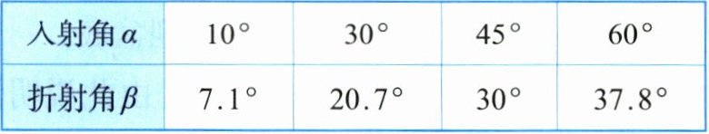 | 折射角$\beta$ | $7.1^{\circ}$ | $20.7^{\circ}$ | $30^{\circ}$ | $37.8^{\circ}$ |
