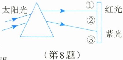 8.如图是太阳光通过三棱镜后在白屏上出现彩色光带的示意图。请据图回答。