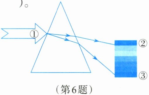 6.将太阳光(图中①)射到三棱镜上,从棱镜另一侧的白纸屏上可以看到一条彩色光带(如图所示),下列说法不正确的是( )。