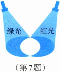 7.如图所示,一束红光和一束绿光照射到白纸上,中间相互重叠的区域呈现______色。如果向重叠区域再照射一束光,使该区域变成白色,则应照射______色光。