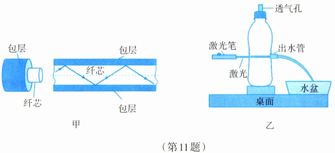 11. 图甲是光纤原理图,图乙是利用水流模拟演示光纤原理的实验装置图。如图乙所示,在一个透明大塑料瓶的侧壁打一个小孔,插入一小段吸管,接口处用热熔胶密封,然后在瓶内装满水,盖上瓶盖并用手指堵住瓶盖上的透气孔。在瓶的另一侧放一支激光笔。调节光束的方向,让光束正好能射中对侧的小孔。松开堵住透气孔的手指,让水流到盆里,会看到光随弯曲的水流照到盆底,在盆底产生一个光斑。