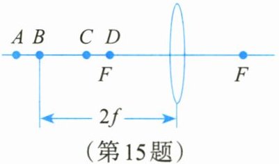 15.如图所示,A、B、C、D是距凸透镜远近不同的四个点,F为焦点。下列光学仪器的成像原理与物体在不同点时的成像情况对应正确的是( )。