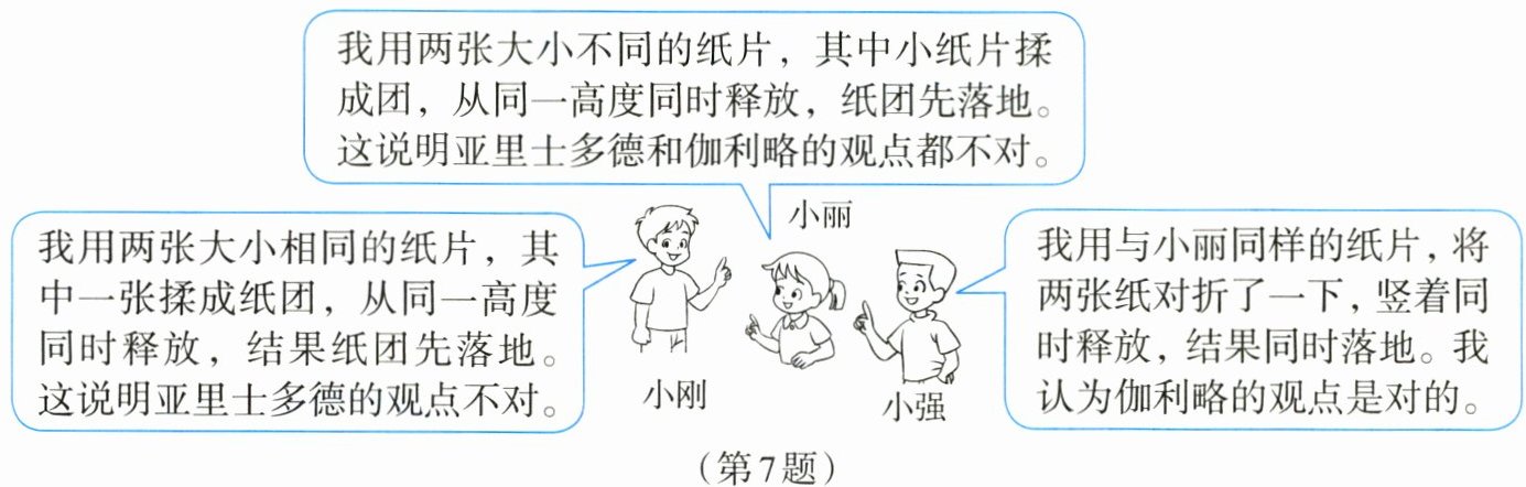 7. 关于物体下落的快慢与物体轻重的关系,历史上曾先后有过两种不同的观点:亚里士多德认为重的物体下落得快,而伽利略认为轻重不同的物体下落的快慢是一样的。如图所示是三名同学在研究了物体下落的快慢与物体轻重的关系后所做的交流: