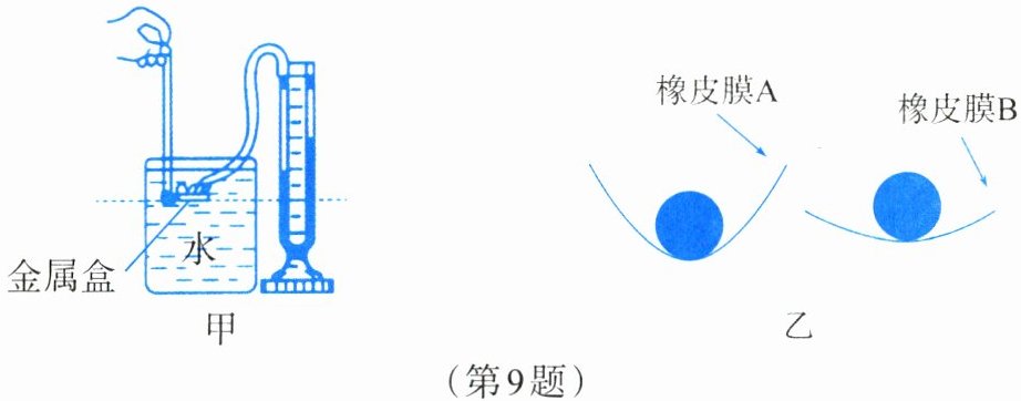 (1)现有两块形状相同、弹性不同的橡皮膜,将相同的小球分别放在这两种橡皮膜上时,橡皮膜的形变程度不同,如图乙所示。因此,在制作压强计时,应选择橡皮膜______(填“A”或“B”)覆盖在压强计金属盒表面。
