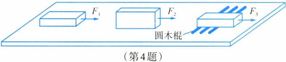4. 在研究摩擦力时,某同学用一块各侧面光滑程度完全相同的木块,在同一水平桌面上进行了三次实验。如图所示,当用弹簧测力计水平拉木块做匀速直线运动时,弹簧测力计三次的示数$F_1$、$F_2$、$F_3$的大小关系为( )。
