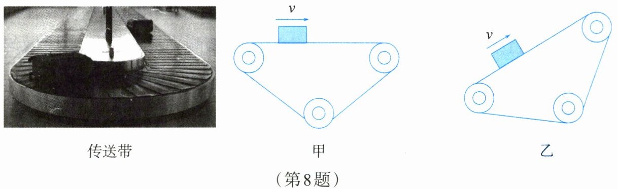 8. 机场用传送带为顾客运送行李,主要有水平运送和沿斜面运送两种形式,甲为水平传送带,乙为倾斜传送带,如图所示。当行李随传送带一起匀速运动时,甲传送带上的行李所受的摩擦力______(填“等于”或“不等于”)零,乙传送带上的行李所受的摩擦力的方向沿传送带______(填“向上”或“向下”,下同)。如果乙传送带上的行李随传送带向下做匀速运动,则行李在运动中受到的摩擦力方向沿传送带______。