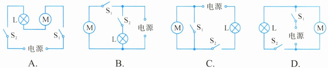 10. 家用电冰箱中消耗电能的器件主要是电动压缩机(用符号表示)和照明灯泡。其中电动压缩机M受温控开关$S_1$控制,照明灯泡L受门控开关$S_2$控制。电动压缩机和照明灯泡既能单独工作,又能同时工作。如图所示是几个同学设计的家用电冰箱的电路图,其中符合要求的是( )。