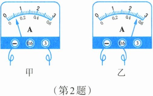 2. 如图甲所示,电流表采用的是______量程,其中每一大格表示______,每一小格表示______,电流表示数为______。某同学对同一电路中的电流采用图乙所示的电流表连接方式进行测量,则电流表的示数为______。比较这两次测量结果,该电路中的电流用______(填“0~0.6A”或“0~3A”)的量程测量更准确一些。