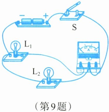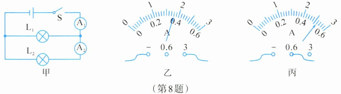 8. 如图所示,当开关S闭合时,两只电流表的示数分别如图乙、图丙所示,则灯泡$L_1$中的电流是( )。