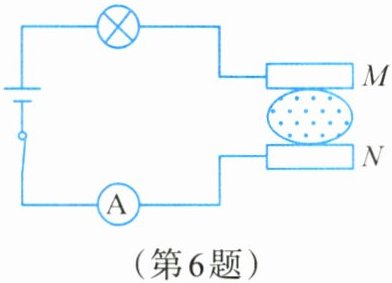 6. 如图所示电路中,金属板M与N之间夹着一块可形变的导体,当两金属板互相靠近一些时,电路中电流表的读数将( )。