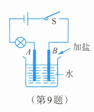 9. 某同学通过学习得知:一般情况下,水的质量一定时,加入食盐的质量越多,溶液的浓度就越大。他想探究食盐水溶液的导电性与什么因素有关,先提出如下猜想: