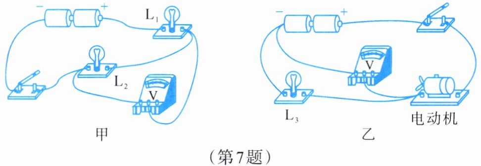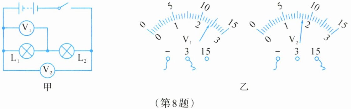 8.某同学用$V_1、$$V_2$两个电压表分别测图甲中两处电路电压,刻度盘上指针位置如图乙所示。则电灯$L_1$和$L_2$两端电压分别为______V和______V。