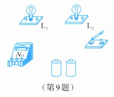 9.如图所示,用笔画线表示导线连接实物图$,L_1、$$L_2$串联,电压表测量$L_2$的电压(估计在2~3V之间),并画出对应的电路图。