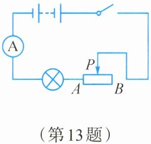13. 如图所示电路,电灯与滑动变阻器是______联的,滑动变阻器连入电路的有效电阻是______部分;闭合开关,滑片P向右移动时,变阻器接入电路的有效电阻______,电流表的示数______,电灯的亮度______。