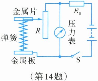 14. 某同学设计了如图所示的压力测量仪,可以反映弹簧上方金属片受到压力的大小。其中R是滑动变阻器,R₀是定值电阻,电源电压恒定不变,压力表实际上是一个电压表。当金属片受到的压力增大时,变阻器的阻值______(填“变大”“变小”或“不变”,下同),压力表示数______。