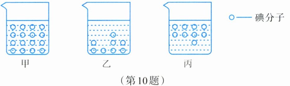 (2)甲、乙、丙三个同学分别画出下面的示意图,表示溶液中碘分子的分布(汽油分子没有画出)。