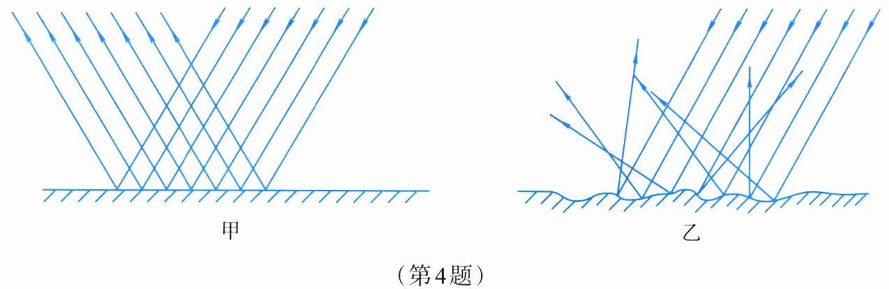 4.下图所示为一束平行光分别照射到两种反射面的光路图,图甲、图乙发生的反射类型分别是______和______。图乙这种反射的光线“杂乱无章”,它______(填“遵循”或“不遵循”)光的反射定律。
