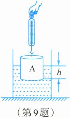 9. 如图所示,圆筒形容器内装有适量的水,放在水平桌面上,高为12cm的实心圆柱形物体A用细线拴好并悬挂在弹簧测力计下方。某同学探究当圆柱形物体A逐渐浸入水中时(水未溢出容器),弹簧测力计的示数F与圆柱形物体A下表面离水面的距离h之间的关系。