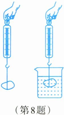 8. 如图所示,某同学将一石块用细线挂在弹簧测力计上,弹簧测力计的示数是3.8N。当把石块浸没在水中时,弹簧测力计的示数为1.5N,那么这个石块受到的重力为______N,浸没在水中时受到的浮力是______N,浮力的方向为______。