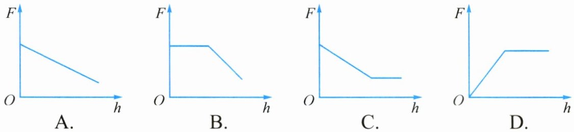 6. 如图所示,将正方体金属块缓慢浸入水中。在金属块接触容器底之前,若以浸入水中的深度h为横坐标,金属块受到的浮力F为纵坐标建立平面直角坐标系,下列图像正确的是( )。