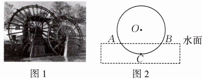 6. 如图1,筒车是我国古代发明的一种水利灌溉工具,明朝科学家徐光启在《农政全书》中用图画描绘了筒车的工作原理。如图2,筒车盛水桶的运行轨道是以轴心$O$为圆心的圆。已知圆心$O$在水面上方,且$\odot O被水面截得的弦AB的长为6$米,$\odot O的半径长为4$米。若点$C$为运行轨道的最低点,则点$C到弦AB$所在直线的距离是(