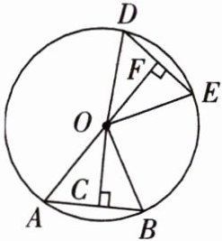 1. 如图,在$\odot O$中,弦$AB= DE$,$OC\perp AB$,$OF\perp DE$,垂足分别为$C$,$F$,则下列说法中,正确的个数为(