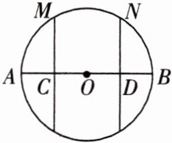 变式演练 如图,在$\odot O$中,$C$,$D是直径AB$上两点,且$AC= BD$,$MC\perp AB$,$ND\perp AB$,$M$,$N在\odot O$上.