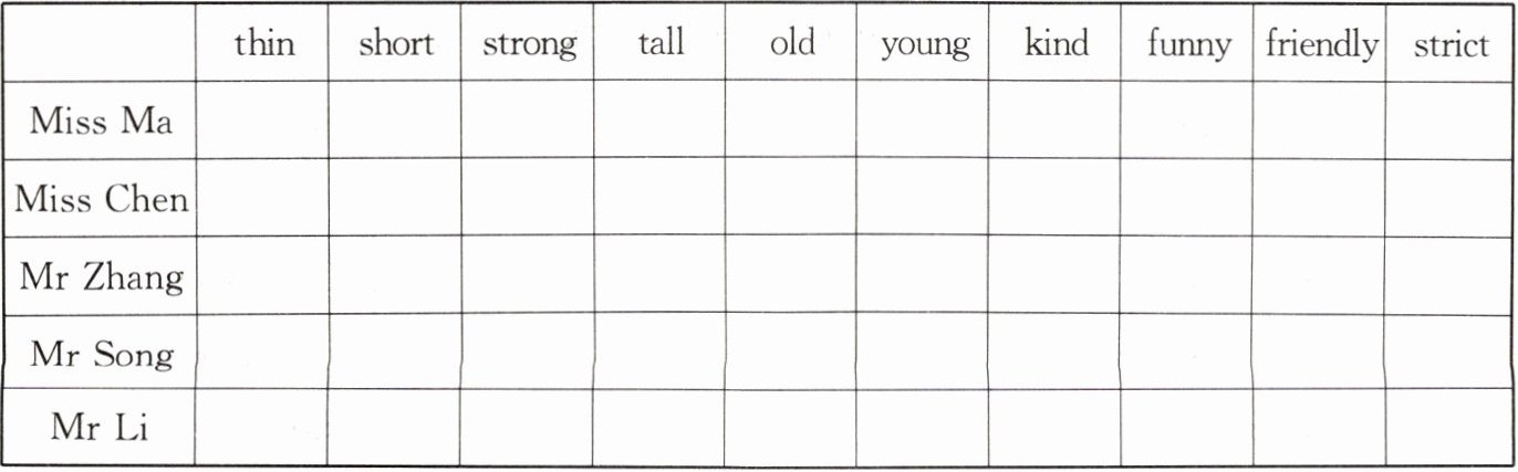 | | thin | short | strong | tall | old | young | kind | funny | friendly | strict |