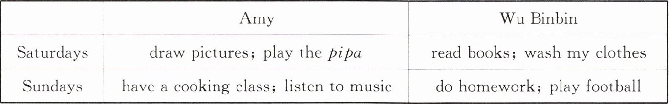 | Saturdays | draw pictures;play the *pipa* | read books;wash my clothes |