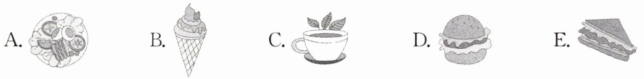 1. sandwiches 2. would like(to drink)some tea 3. hamburger 4. ice cream 5. salad 6. to eat