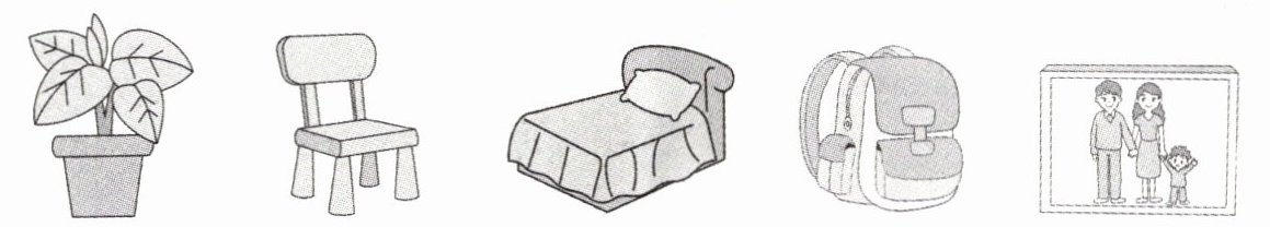 My name is Oliver. Look! This is my room. It's nice. There are two chairs. One is white, and the other (另一个) is red. My schoolbag is behind the white chair. There are three storybooks on the red chair. My family photo is above the red chair. Beside the red chair, there is a desk. You can see a computer and a clock on it. And my ball is beside the desk. Near the window, there is a small bed. A plant is between the bed and the desk.