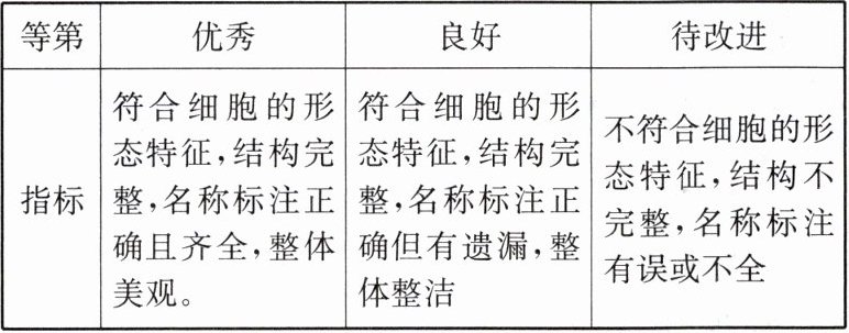 |指标|符合细胞的形态特征,结构完整,名称标注正确且齐全,整体美观。|符合细胞的形态特征,结构完整,名称标注正确但有遗漏,整体整洁|不符合细胞的形态特征,结构不完整,名称标注有误或不全|