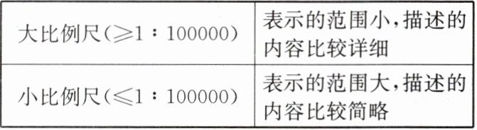 |大比例尺(≥1:100000)|表示的范围小,描述的内容比较详细|