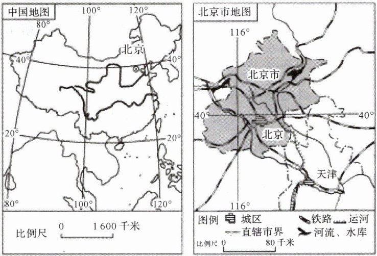 6. 如图为图幅大小相同的"中国地图"与"北京市地图",两图中( )