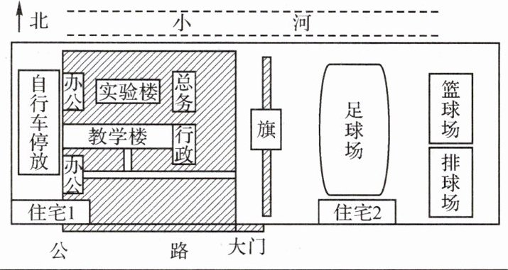地图上的方向有不同的表示方式:在有指向标的地图上,指向标箭头的指向一般为北方。读图可知:实验楼位于教学楼的正北方向,篮球场位于大门的东北方向。地图的三要素是方向、比例尺、图例和注记,该图还缺少比例尺。