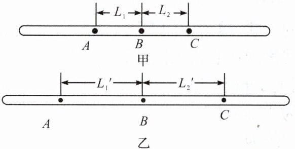 步骤一:用红墨水在浅色橡皮筋上依次点上等距离的三点 A、B、C,如图甲所示,使 $L_1= L_2= 1cm$;